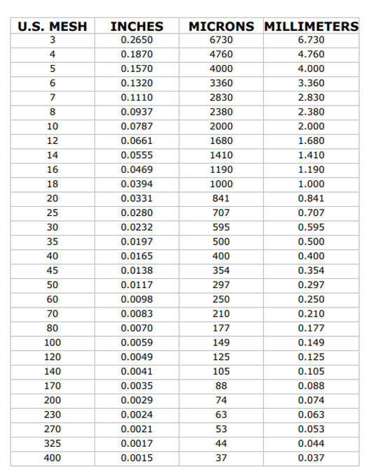 Mesh: refers to the number of empty holes in the screen per square inch. 50 mesh means 50x50 holes per square inch, and 500 mesh means 500x500 holes. The higher the mesh, the more holes. In addition to representing the holes in the screen, it is also used to represent the size of the particles that can pass through the screen. The higher the mesh, the smaller the size.